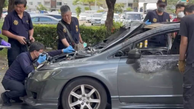 ▲林士杰8日清晨在住處門口遭槍擊送醫不治,警方案發后在南區一處停車場找到疑似用來接應槍手用的自小客車,車輛疑遭縱火滅證,鑒識人員到場進行采證。中央社