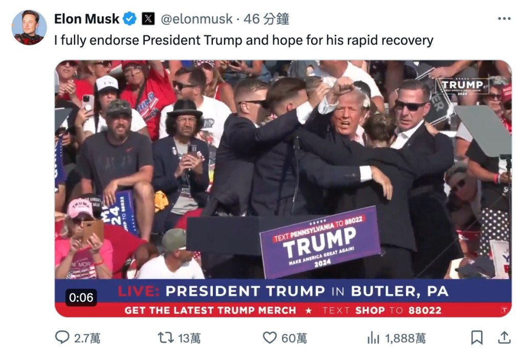 ▲槍擊后,馬斯克表態支持特朗普競逐總統。