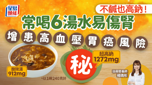 部分湯水味道不咸,但其實暗藏高鈉陷阱,長期飲用易致高血壓及胃癌。有注冊營養師列出9款常見湯水的熱量及鈉質,其中有6款鈉質相對高,包括不少港人喜愛的湯水。
