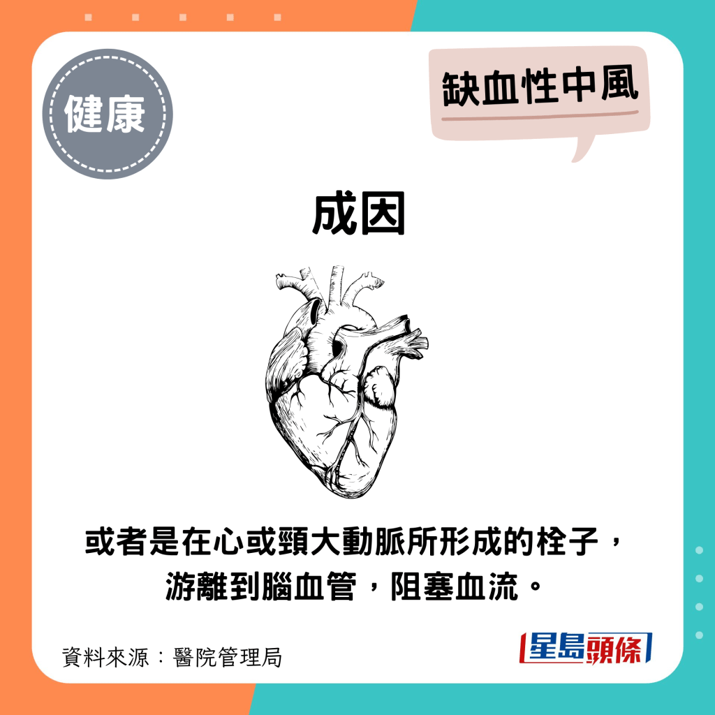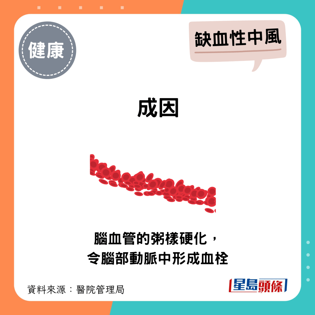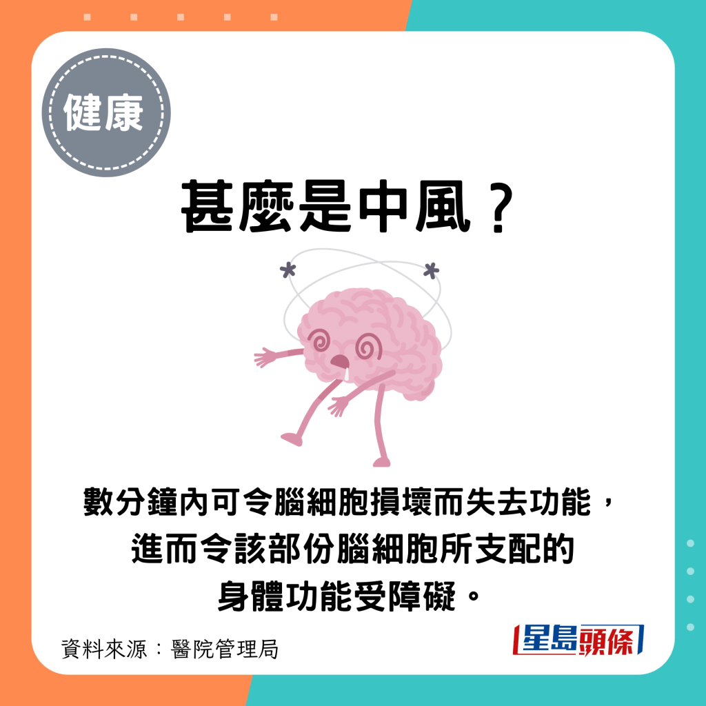 衛生署指出,“中風”即是“腦血管意外”,是由于腦部血管“阻塞”或“爆裂”,令腦組織不能得到充份的養料和氧氣,受影響的神經細胞因而壞死,產生各種神經癥狀。