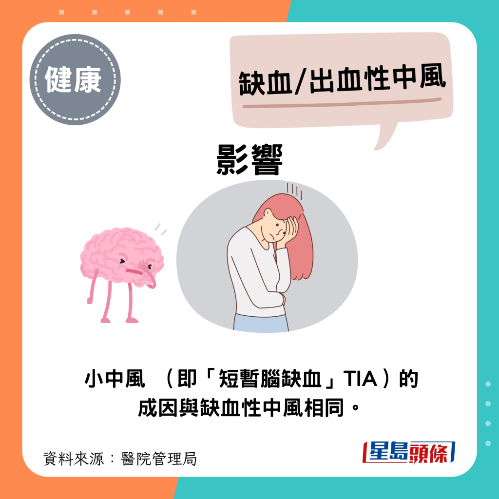 醫管局指出,小中風的征狀與中風一樣,但只持續數分鐘便消失,而無遺留永久殘障,病人可有一次或數次的小中風,這可能意味真正中風的來臨。局方提醒,若身體出現警號,應立即求醫。