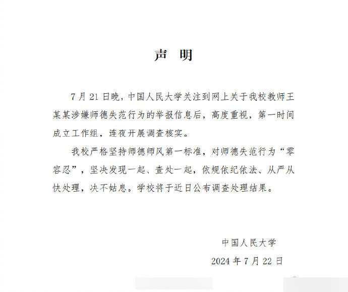 ▲人民大學發聲明,指已設工作組調查投訴及對師德失范行為零容忍。