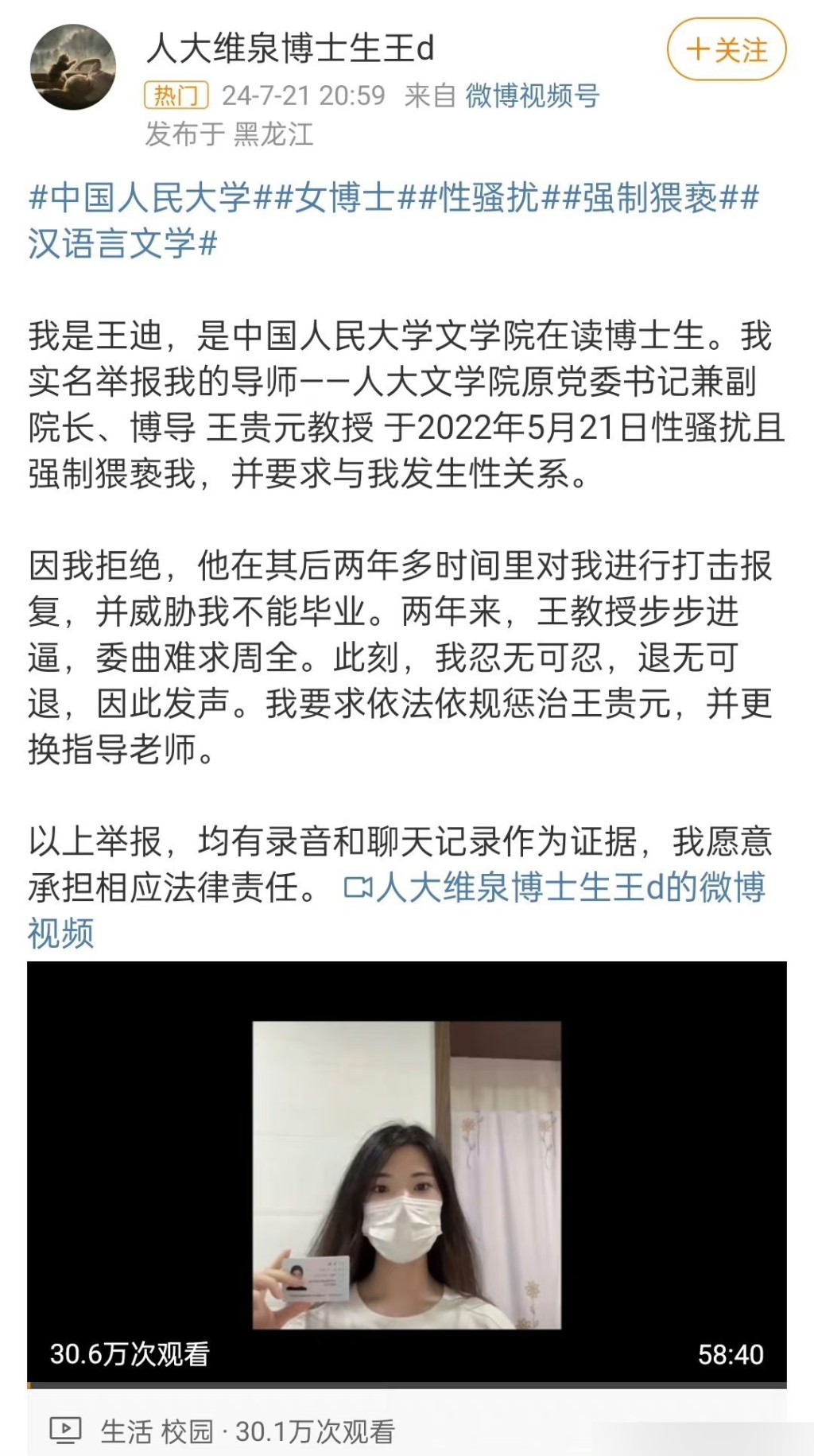 ▲北京人民大學女博士生王迪實名舉報遭導師王貴元猥褻、性騷擾。