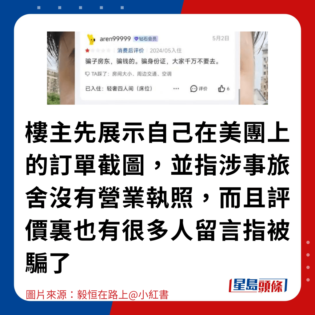 ▲樓主先展示自己在美團上的訂單截圖,并指涉事旅舍沒有營業執照,而且評價里也有很多人留言指被騙了