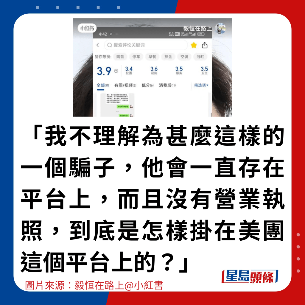 ▲「我不理解為什么這樣的一個騙子,他會一直存在平臺上,而且沒有營業執照,到底是怎樣掛在美團這個平臺上的?」