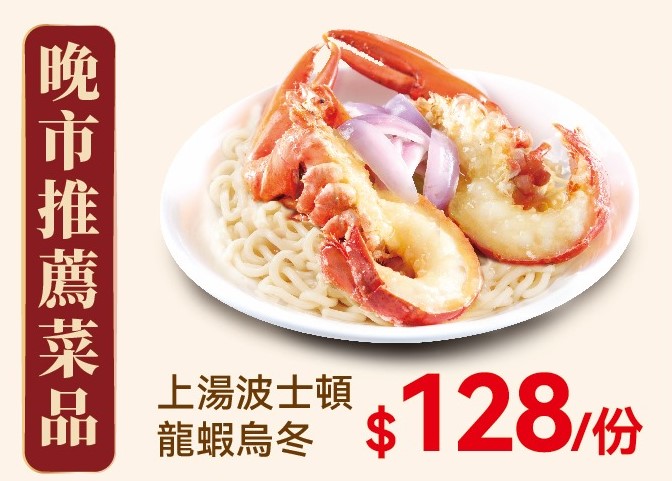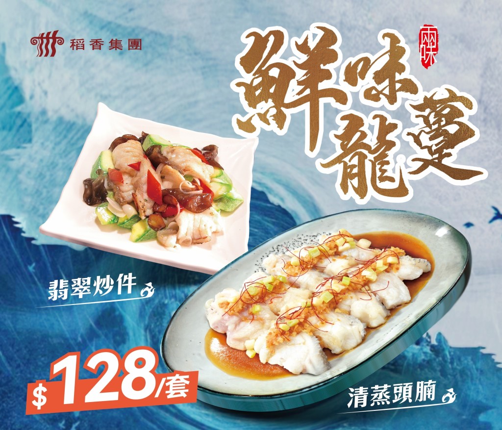堂食顧客凡于星期一至日及公眾假期,晚上5時半至8時半到全港任何一間稻香、稻香茶居、稻香超級漁港及稻坊分店,即可以$128的優惠價享用“鮮味龍躉兩味”,包括翡翠炒件及清蒸頭腩各一碟,另有多達七款晚市推薦菜品優惠(詳見上文圖輯),從$28/盅的鮑魚汽鍋湯至$128/份的上湯波士頓龍蝦烏冬亦相當抵食。