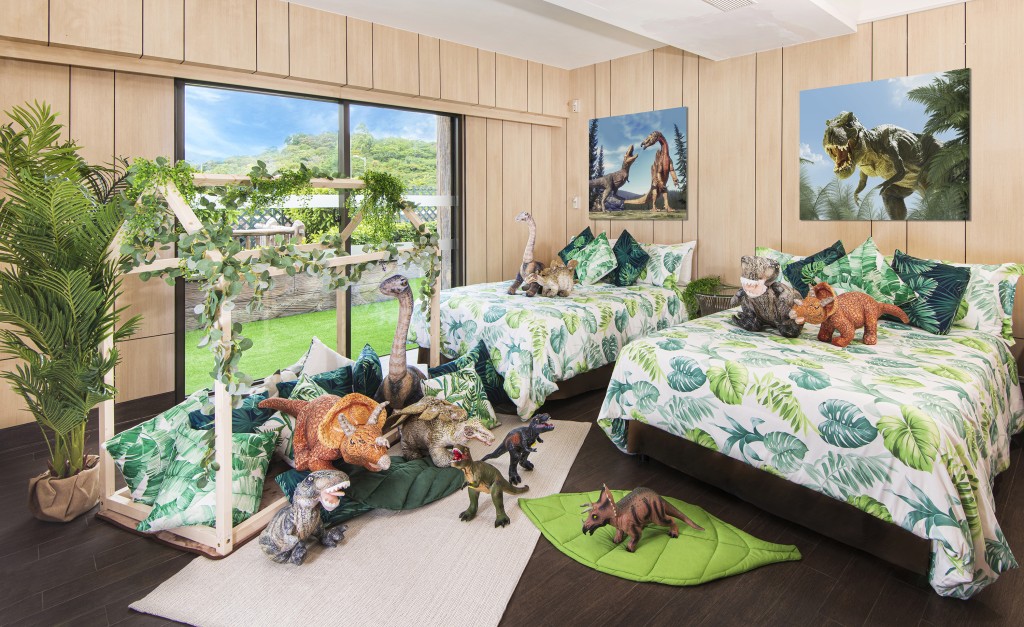 入住挪亞方舟度假酒店的“恐龍歷險世界”主題房,在叢林布置的房間內與暴龍、大椎龍及三角龍等不同恐龍同眠。