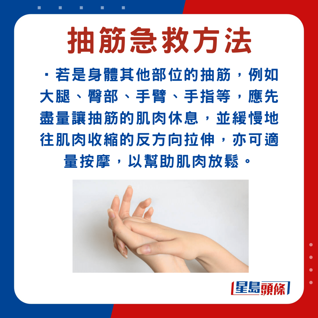 · 例如大腿、臀部、手臂、手指等,先盡量讓抽筋的肌肉休息,并緩慢地往肌肉收縮的反方向拉伸,亦可適量按摩,以放松肌肉。