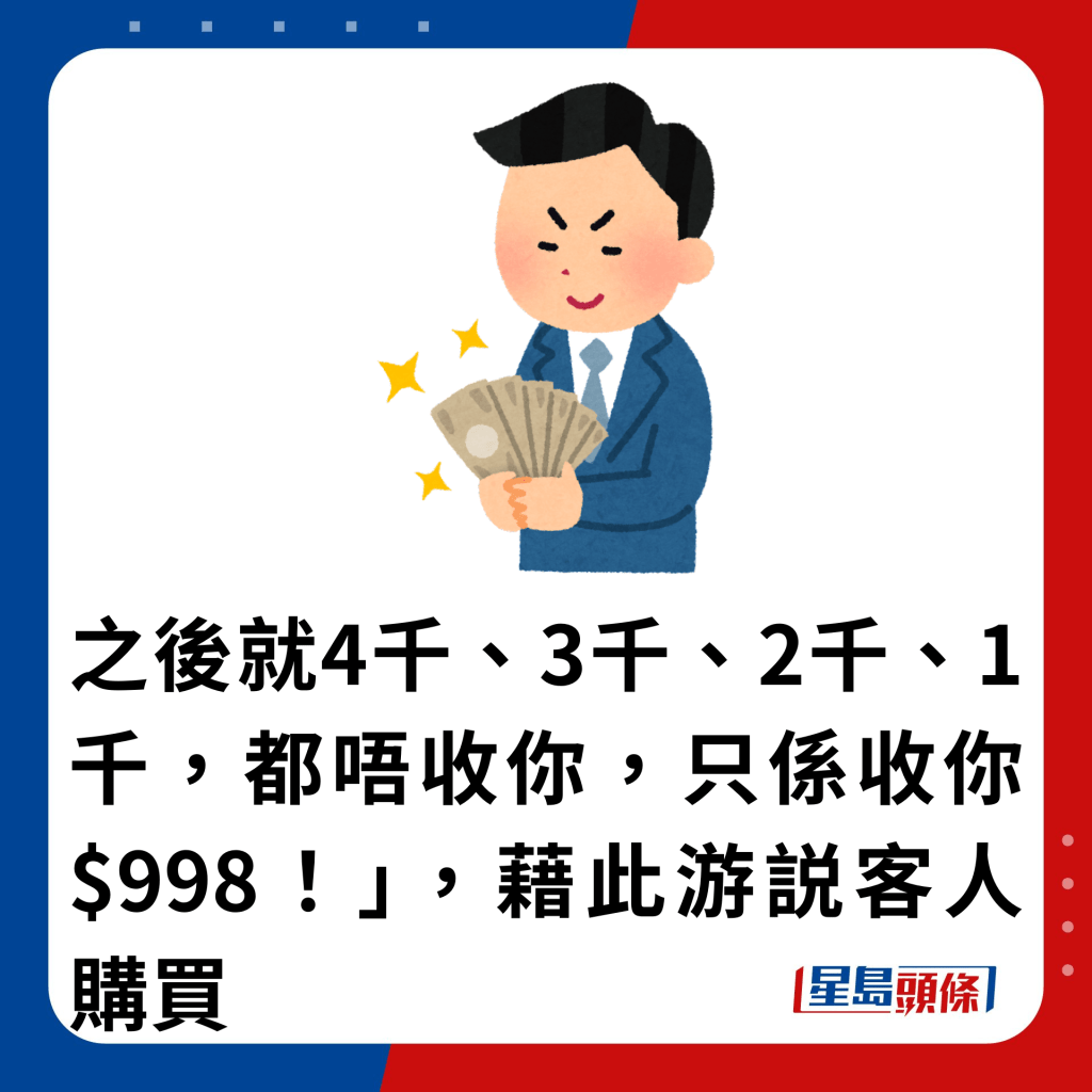 ▲之后就4千、3千、2千、1千,都唔收你,只系收你$998!」 ,借此游說客人購買