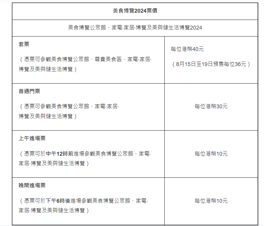 今年美食博覽繼續設有不同門票種類,包括適用于不同區域的套票(包尊貴美食區),每位$36起(8月1至14日預售每位$36;8月15至19日每位$40);普通門票每位$30;上午及晚間入場門票優惠價$10。