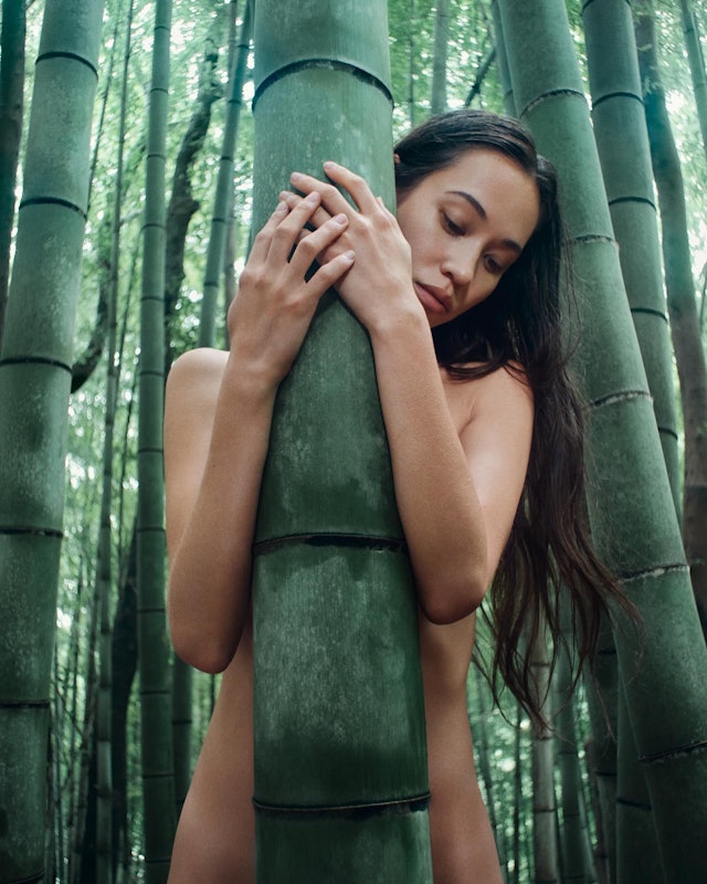 ▲照片中的水原希子置身于一處竹林之中,巧用周圍的竹子遮蔽身體,散發出極致的性感魅力。