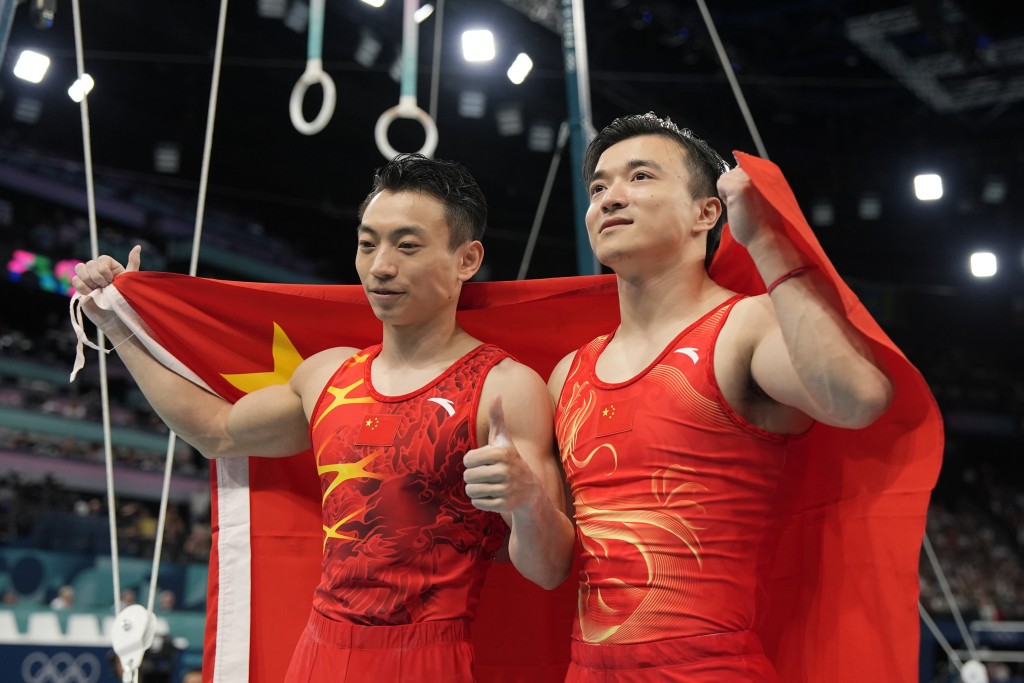 ▲巴黎奧運男子吊環決賽,鄒敬園(左)及劉洋賽后慶祝。AP