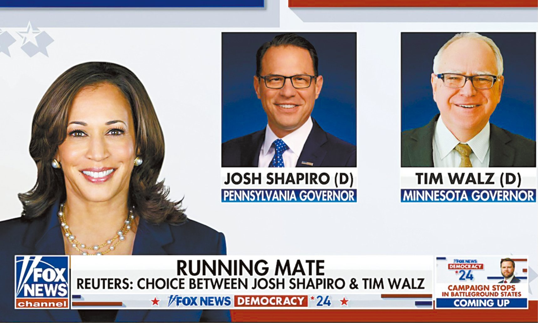 ▲消息指,副總統搭檔人選的最終名單已縮窄至兩人,分別是賓州州長夏皮羅以及明尼蘇達州州長沃爾茲。電視截圖