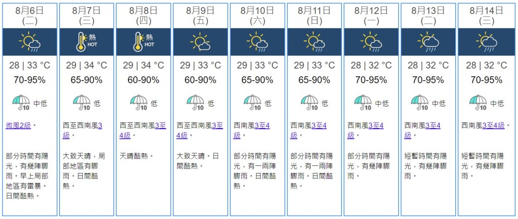 ▲香港天文臺預測,立秋當日(8月7日)及隨后幾日天氣(資料來源:香港天文臺)