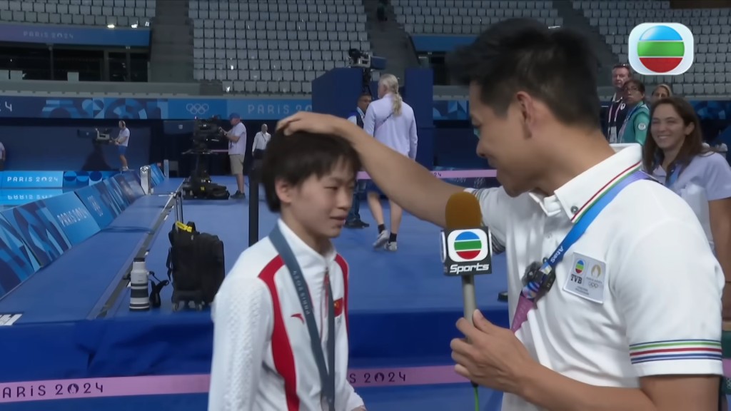 何沖上星期在巴黎奧運擔采訪全紅嬋及陳芋汐時,何沖看到全紅嬋拿著心愛的公仔前來做訪問時,他立即摸摸全紅嬋,并說:“給我抱一下”,然后把全紅嬋擁入懷中,訪問結束更拿出電話與兩位小師妹自拍。 到了昨日(6日)何沖成功獨家訪問女子10米高臺跳水金牌得主全紅嬋,何沖以刁鉆的問題提問全紅嬋,指全紅嬋從第二跳開始就出現一些小失誤,問她會否因小失誤影響心態,害怕沒拿到金牌? 全紅嬋回答:“我不害怕,因為有她(陳芋汐)在后面......”全紅嬋眼神望向鏡頭方向,估計有人叫她伸直受訪,她企直后就接不上回應,此時何沖輕拍全紅嬋的膊頭,以示鼓勵,訪問最后何沖要求拿她的金牌,隨后就再出手摸全紅嬋的頭頂。