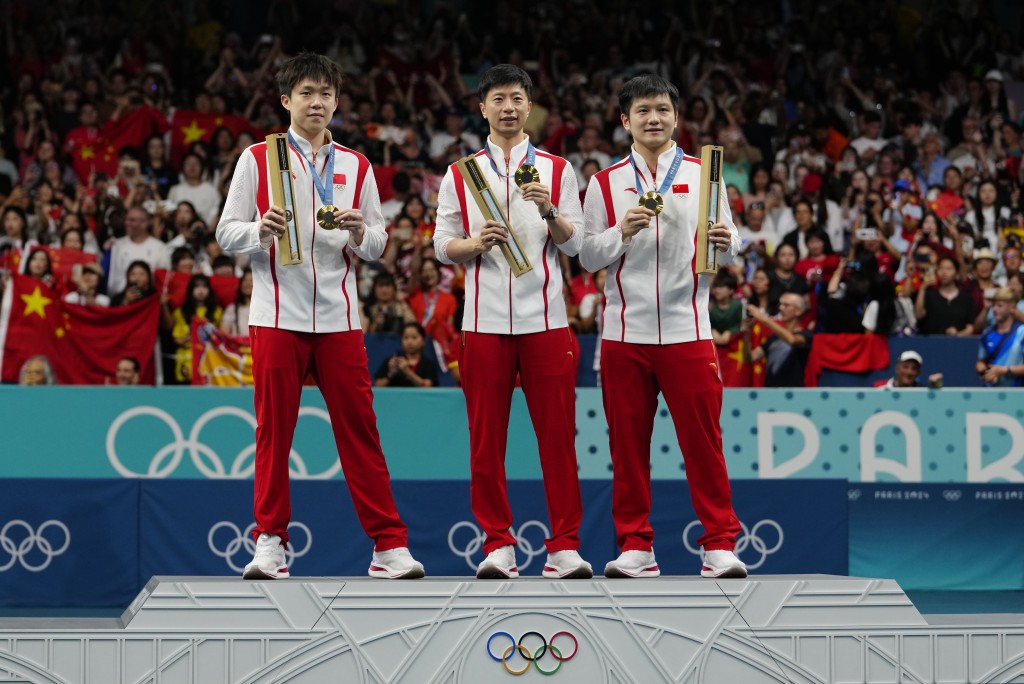 ▲馬龍(中)是“超級全滿貫”男子乒乓運動員,被封“國乒一哥”。AP