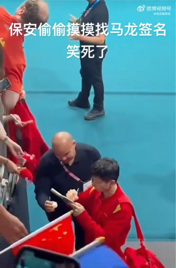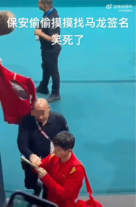 被熱情球迷叫停的馬龍,亦相當識做,留步為球迷簽名,在場館近出口位置開了一個小型簽名會。影片在微博瘋傳,網民除了贊嘆馬龍的人氣,亦留意到場內一名外籍男保安悄悄走到馬龍身邊求簽名的舉動,話題“保安偷偷找馬龍簽名”即沖上熱搜榜。影片可見,馬龍離場時走近觀眾席簽名,一名外籍男保安表現嚴肅地走近馬龍,本以為他為顧馬龍安全,上前保護馬龍,但他卻笑著從褲袋中拿出一個乒乓球,遞給馬龍希望對方簽名。馬龍友善為該保安簽名后,對方回到工作崗位,開心得向同事作狀地揮拳,可見他表現出作為球迷的興奮心情。網民都笑指馬龍魅力大,亦對健碩保安的反差感覺得可愛。