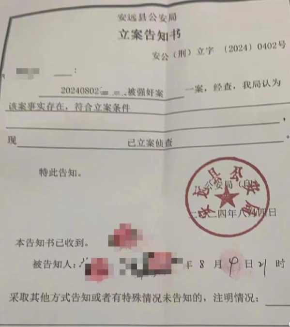 而據公安局8月4日晚9時出具的《立案告知書》顯示,杜某某涉嫌被強奸一案,“經查,我局認為該案事實存在,符合立案條件,已立案偵查?!?/p>