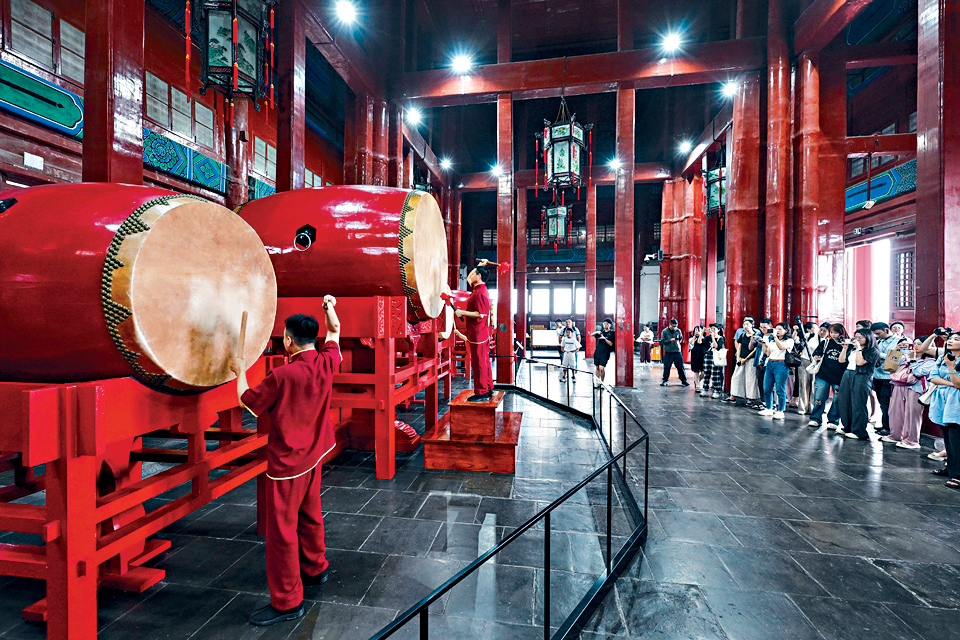 ▲登臨鐘鼓樓的鼓樓,有機會看到精彩的擊鼓表演。