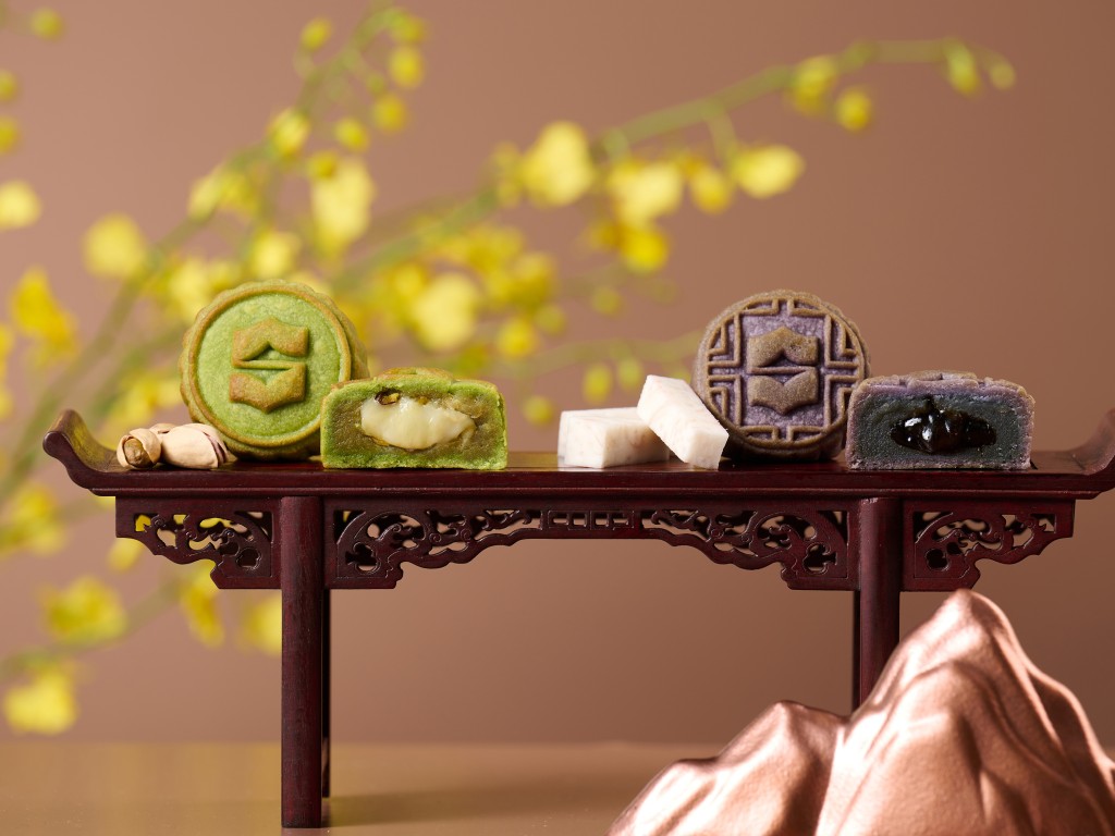 ▲芋頭開心果麻糬月餅,香軟粉糯的麻糬分別配搭芳香的芋頭及酥脆的開心果,煙韌富嚼勁,層次鮮明。($408 港島香格里拉酒店)