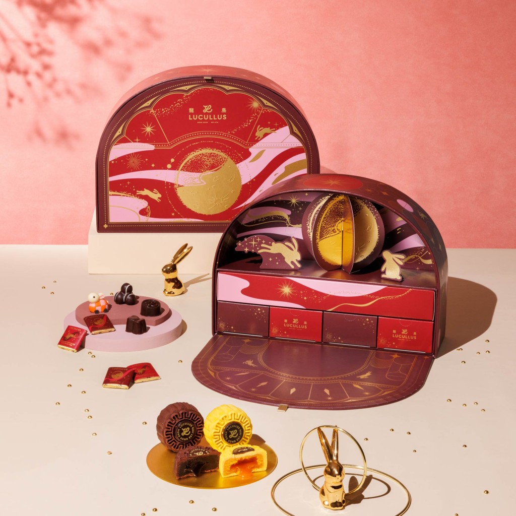 ▲朗月中秋月餅禮盒,半圓拱形禮盒印上燙金的應節圖案,設計優雅,內有奶黃流心及朱古力流心月餅,以及多款手工朱古力。($408 龍島)