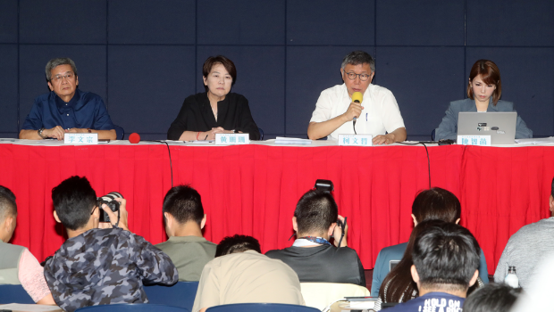▲時任競總副總干事陳智菡(右起)、民眾黨主席柯文哲、時任競總總干事黃珊珊、時任競總財務長李文宗12日出席記者會。中時網