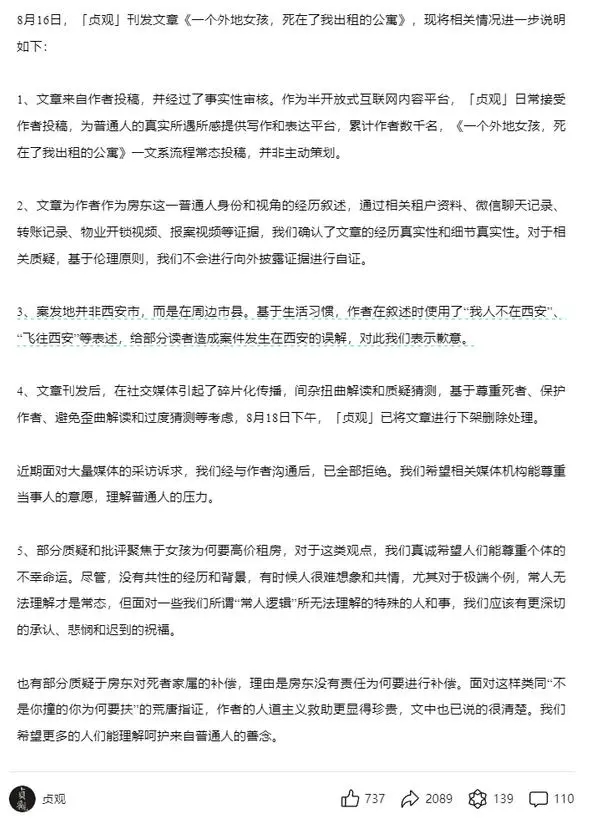 上周五(16日),微信公眾號“貞觀”發布《一個外地女孩死在了我出租的公寓》一文,作者為“十二橡樹”,其自稱一寧夏女子死在自己西安的30樓出租公寓。 文章發出后,不少網友曾質疑事件內描述的情況。 周日(18日),“貞觀”刪除該文后聲明文中所述為真實事件。 昨日(19日),傳媒“極目新聞”從多方核實獲悉,事件發生在咸陽市秦都區。 秦都區主要負責人表示,確有此事,已排除他殺,家屬不讓尸檢。