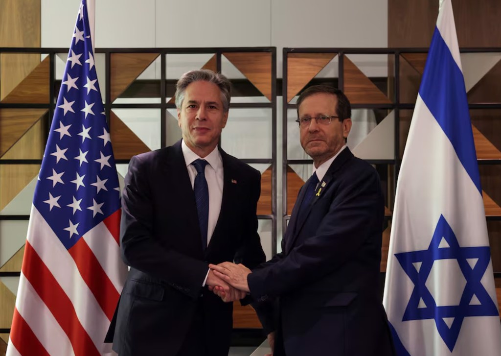 ▲美國國務卿布林肯抵達耶路撒冷,與以色列總統赫爾佐格見面,再次勸告以色列盡力完成人質釋放協議。(圖/路透社)