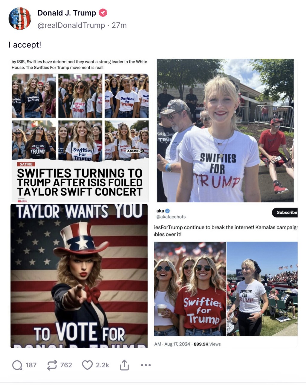 美國大選即將開幕,前總統、共和黨總統候選人特朗普在社交平臺上轉發一張由人工智能(AI)生成的照片,顯示樂壇天后Taylor Swift支持特朗普,并呼吁選民投票給他。 事件引起Taylor Swift的粉絲不滿,有專家指,利用假照片宣傳恐怕只會招致反效果。