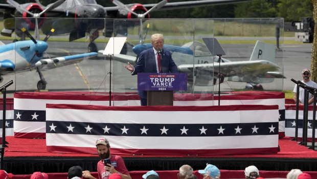美國共和黨總統候選人特朗普今天在搖擺州北卡,舉行他遭遇槍擊負傷以來首場戶外造勢活動,當他演說時講臺上架有防彈玻璃,以免有人再度嘗試開槍暗殺。