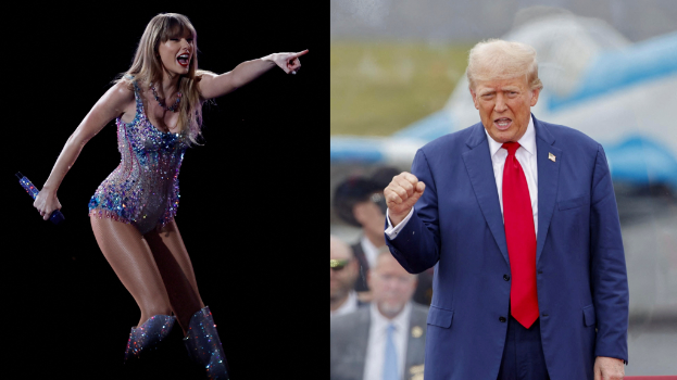 ▲美國流行天后泰勒(左)在2024美國總統大選尚未表態。代表共和黨出馬的前總統特朗普(右)在社群媒體官方賬號張貼泰勒要粉絲支持特朗普的圖片。(路透)
