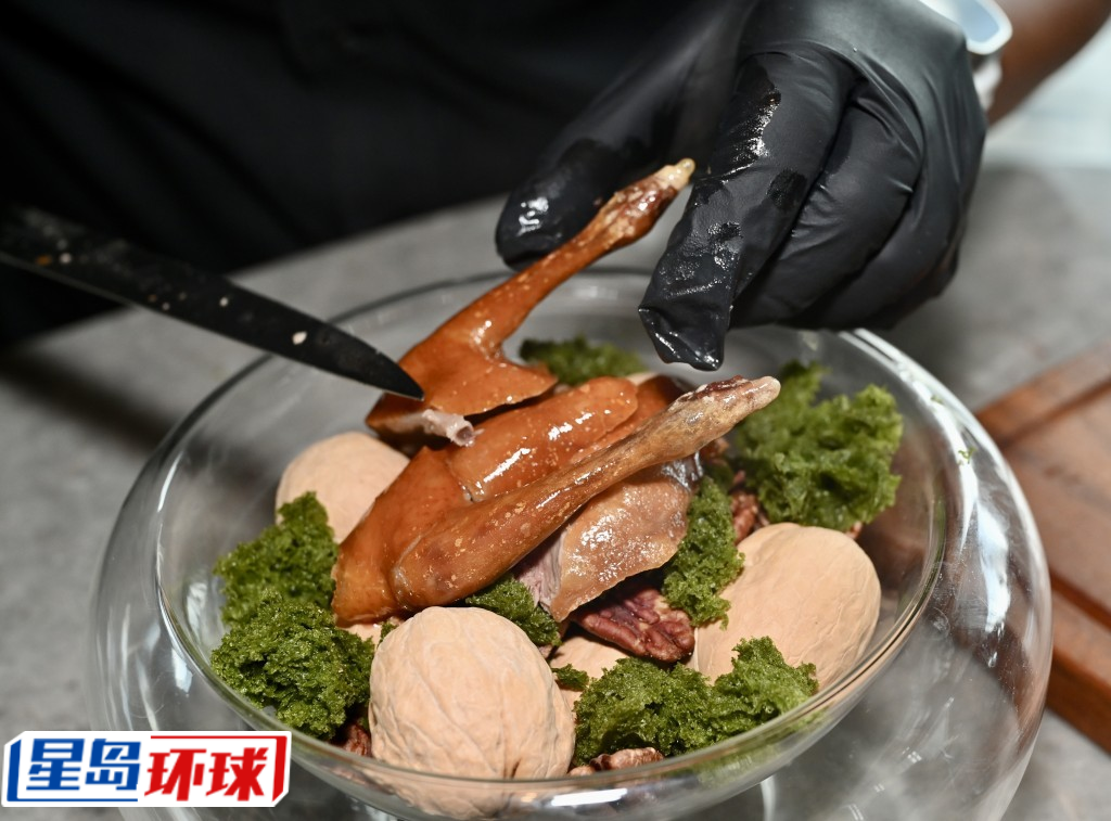 乳鴿是粵菜常用食材之一,做法多以燉湯、鹵水或酥炸,但洪師傅的做法就與別不同。他堅持選用只有約18天大的雛乳鴿,先醃味后風干,再以滾油炸至剛好熟,然后起肉再以核桃殼煙熏,提升入口時的香氣及味道層次。