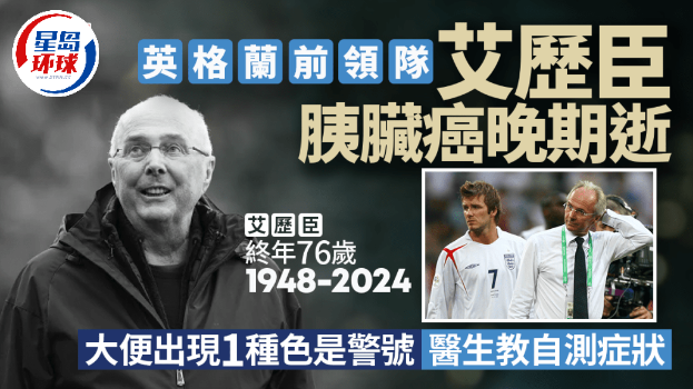 埃里克森/英格蘭領隊/曼城/胰臟癌|前英格蘭國家隊領隊埃里克森(Sven-G?ran Eriksson),周一(26日)因胰臟癌病逝,終年76歲,去世時家人陪伴在側。胰臟癌部分癥狀與小病小痛相似,容易被忽略,或誤以為是普通消化不良。醫生指出,若發現大便呈現一種顏色就要留神,隨時是患上胰臟癌的警號。