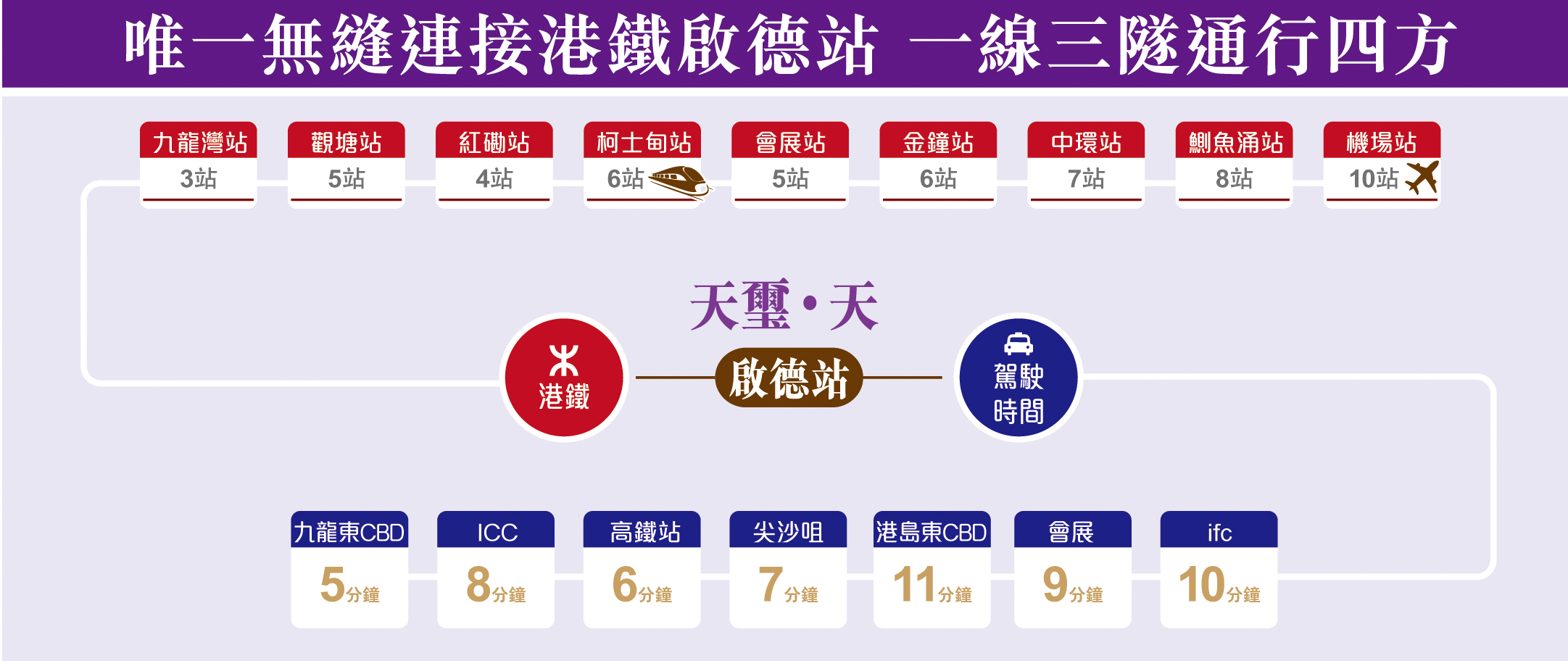 項目專享一線三隧的優勢,駕車人士方面,在六號干線建成后,在繁忙時段途經將藍隧道位于藍田交匯處西面出入口與中九龍干線位于啟德交匯處的東面出入口的行車時間,估計會由現時約15分鐘減至約3分鐘。而由啟德駕車出發,約5分鐘即達九龍東CBD、高鐵站約6分鐘、尖東約7分鐘、ICC約 8分鐘、灣仔會展約9分鐘、中環ifc約10分鐘,而港島東CBD亦只需11分鐘。