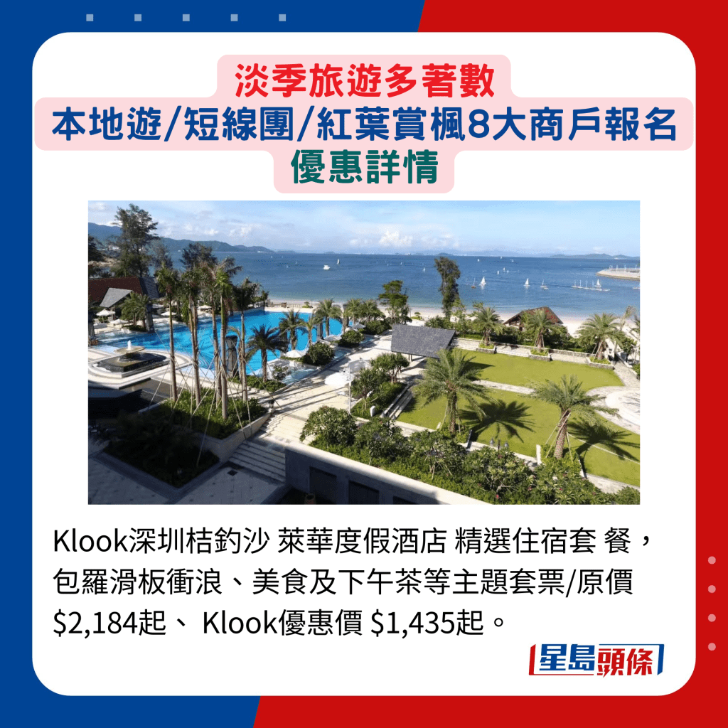 打算忙里偷閑輕松一兩天,澳門、深圳及中山等短線 游正適合不過,而香港及旅游玩樂預訂平臺KKday不乏精選推介。當中首推深圳至中山的旅行團,如“石岐乳鴿、 脆肉鯇燒鵝、神灣菠蘿美食一日游”,以及“中山美食休閑 2天團”等,既可一試最新開通的深中通道,更可獲贈行李 箱,性價比甚高! 此外,Klook也不乏短線游推介,尤以酒店住宿最具吸引力,好像“蜜悅·深圳藍白圣島懸崖泡池美宿套餐”, 民宿鄰近海邊,主打希臘風格,令人恍如置身地中海氛圍,此套餐除了包括早餐及下午茶外,還有美拍服務,最 適合跟好友或一家大小打卡影靚相,悠閑歡度周末。