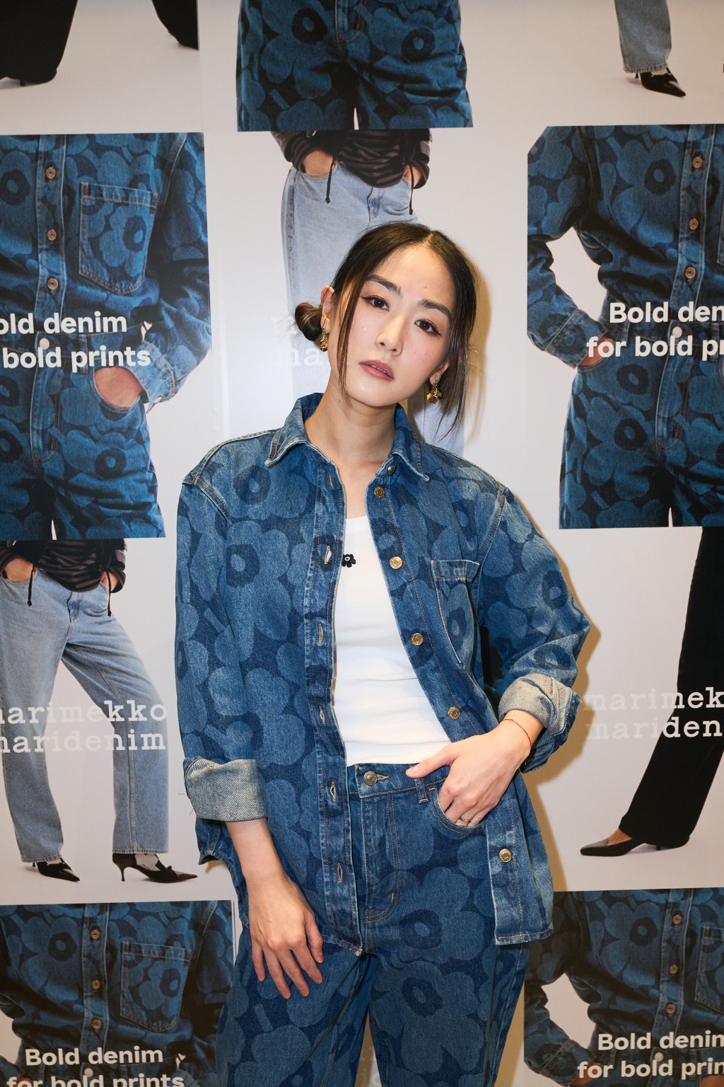 ▲本地女星蔡穎恩以Marimekko首個Maridenim牛仔系列的Unikko印花恤衫,配搭Unikko印花牛仔褲,塑造 Tone-on-tone視效。