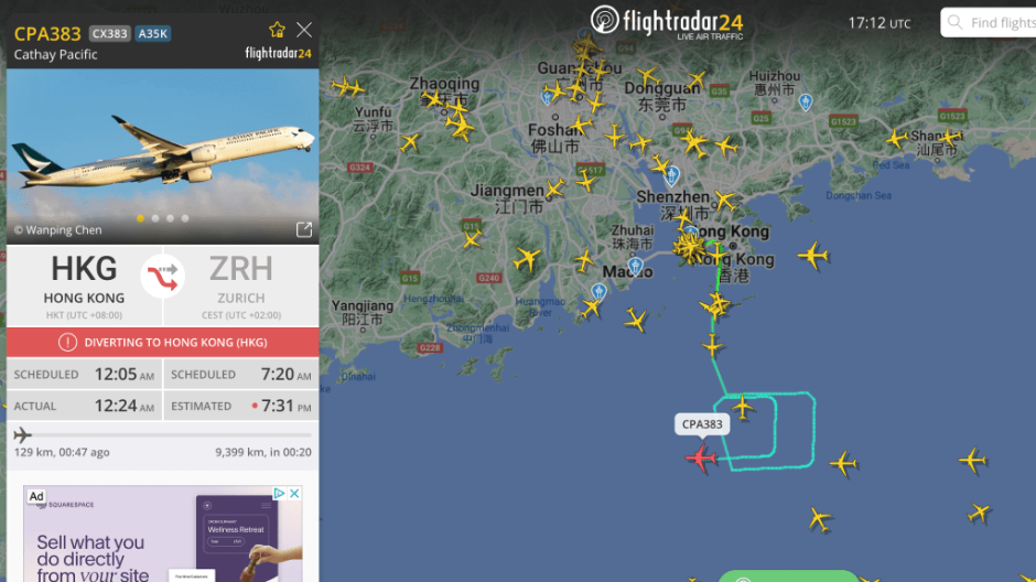 ▲國泰航空飛往瑞士的航班警告燈亮起,安全折返香港機場。(圖片來源:Flightradar24.com截圖)