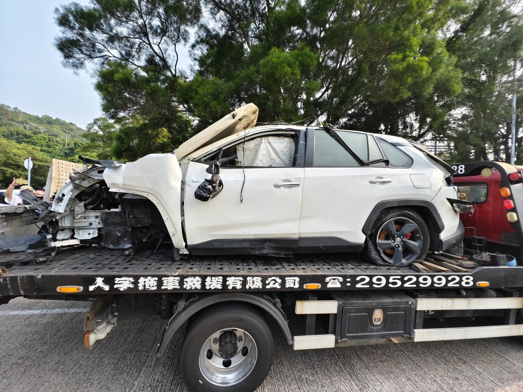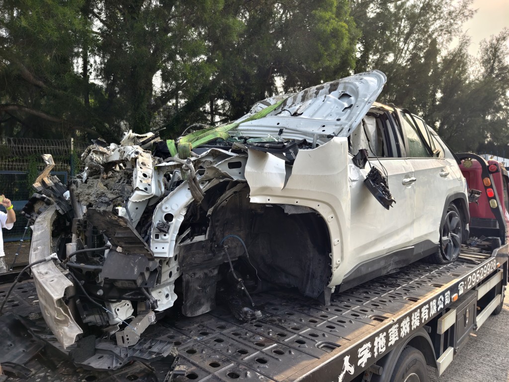 據現場所見,失事車輛為豐田RAV4,其左前輪及右尾輪均已經不知所終。私家車左邊車門大致完整,安全氣袋彈出;右邊車門則嚴重凹陷變形,且滿佈泥濘,相信為墮海著海床一側。至于車頭則被強大沖擊力撞至盡毀,無法辨認原樣,車頭蓋亦被掀起,工人運送時殘骸時需要用索帶扣穩。