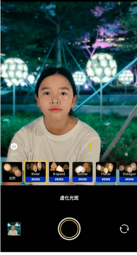 伴隨蔡司鏡頭而來的,還有為人像拍攝而設的7種經典蔡司鏡頭風格,簡單轉換Biostar、B-speed、Sonnar、Planar、Distagon、Cine-flare及Cinematic風格,即可為背景加入不同的虛化光斑,以獨特散景效果襯托主體。獨有風格以外,V40 5G預設了23mm風景、35mm街頭、50mm自然及50mm經典4種人像焦段,一按便可轉換角度重新構圖。