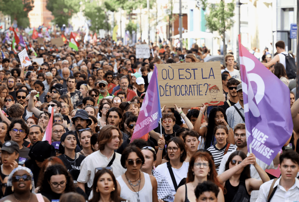 人潮揮舞著不屈法國、巴勒斯坦、彩虹旗等旗幟,以及“民主倒退”、“馬克龍下臺”、“尊重選舉”等標語。示威者以學生、年輕族群為主,也有不少退休人士參與。