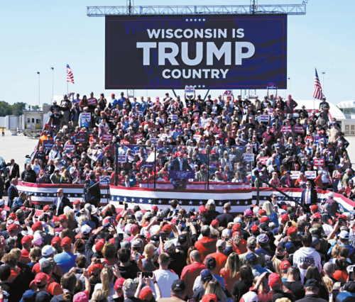 ▲特朗普在威斯康辛州造勢,重申會整頓政府部門并削減聯邦開支。 美聯社