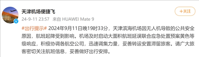 9月11日晚,天津濱海機場當天從晚上7點40分左右開始,所有進出港航班停止起飛和降落。當晚8時許開始,陸續有網友發布消息稱,天津濱海機場出現航班大面積無法起降的情況,疑因機場受到無人機影響。