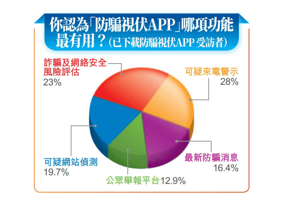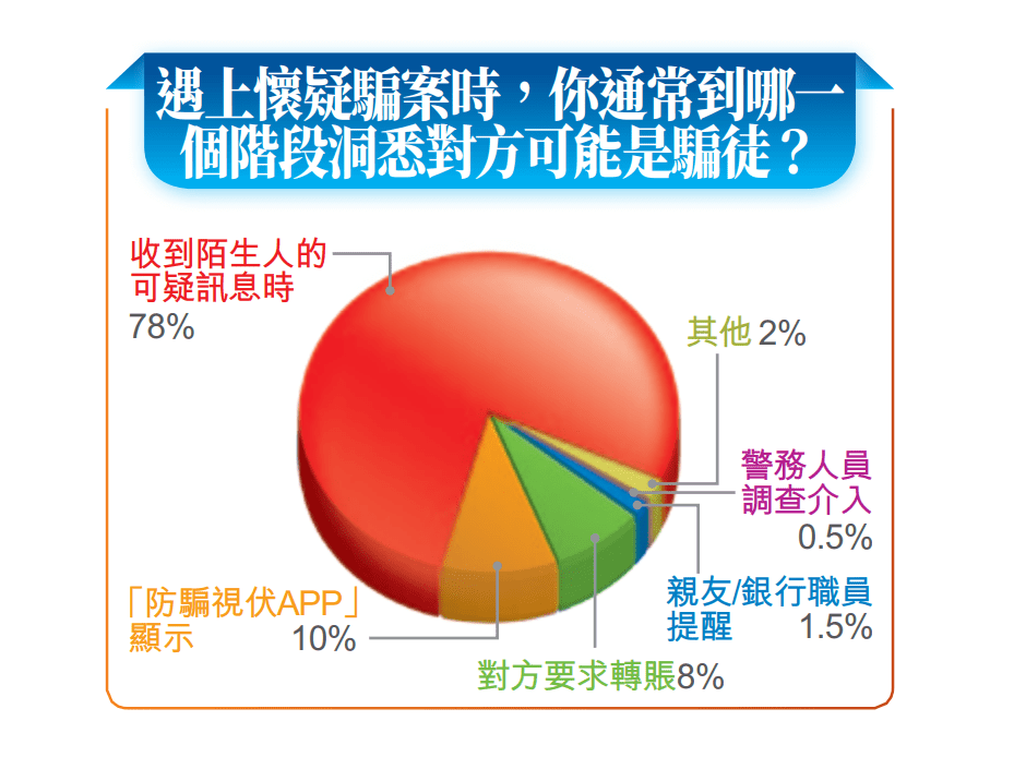 在騙徒水銀瀉地式攻擊下,43%受訪市民在過去一個月遇到懷疑騙案6次或以上,當中一成人更多達20次或以上。78%受訪市民表示,當收到陌生人的可疑訊息時,已洞悉對方可能是騙徒;一成人指在使用警方“防騙視伏APP”后得悉;8%要到騙徒要求轉賬時才醒覺。