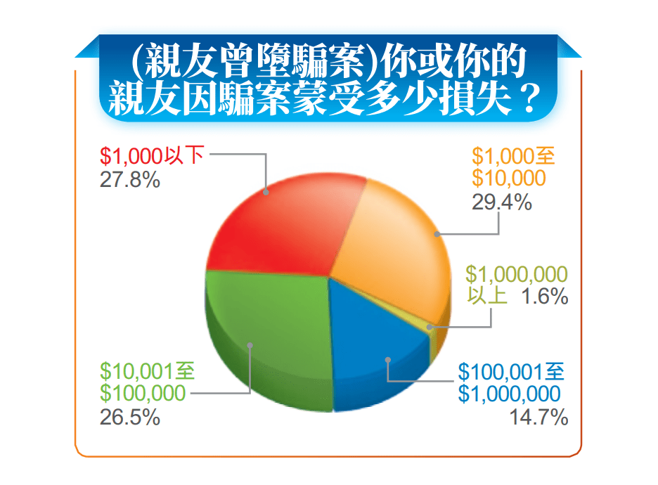 另外有32%受訪市民表示,自己或親友曾墮騙案,當中逾八成損失10萬元(港幣,下同)或以下,1.6%損失100萬元以上。