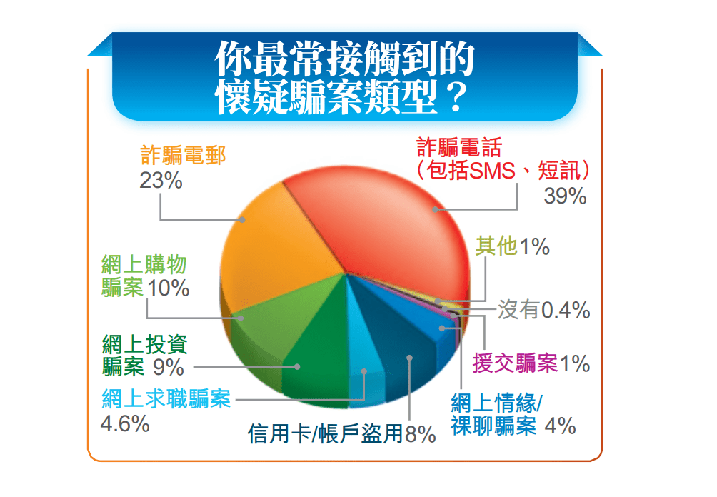 今次調查是以網上問卷形式于《星島頭條App》及《星島頭條》網站進行,總參與人數超過1萬,反應相當踴躍。結果顯示,有逾9成受訪市民表示在過去一個月曾遇懷疑騙案;被問到“你最常接觸到的懷疑騙案類型?”以詐騙電話最多,達39%;其次是詐騙電郵,占23%;之后是網上購物騙案,占10%。