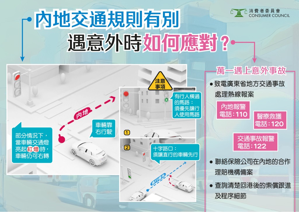 與香港的交通規例不同,在內地駕駛時,當車輛交通燈為紅燈或仍可右轉。惟駕駛者須留意,如為十字路口,須讓直行的車輛先行; 如為有行人橫過的馬路,則須優先讓行人使用馬路。
