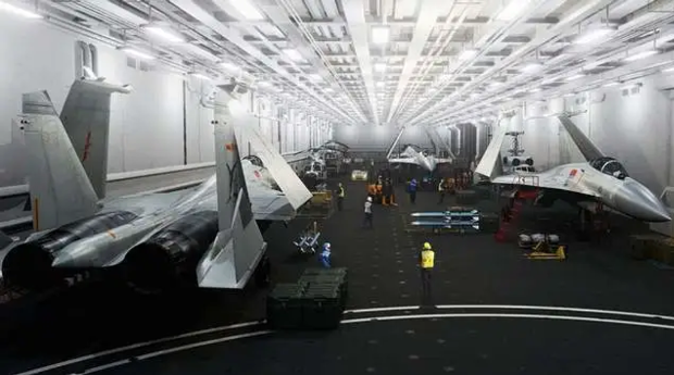 報導說,福建艦在宣傳片《淬火》中,首次曝光包括航母機庫在內的一些內部結構,畫面顯示其船艙容積相當巨大,比6萬噸級的遼寧艦和山東艦的機庫整整大了一圈,如此當然可以容納更多的艦載機。而除了機庫的容積之外,外界也注意到了機庫的防火門與遼寧艦、山東艦有明顯的差異。