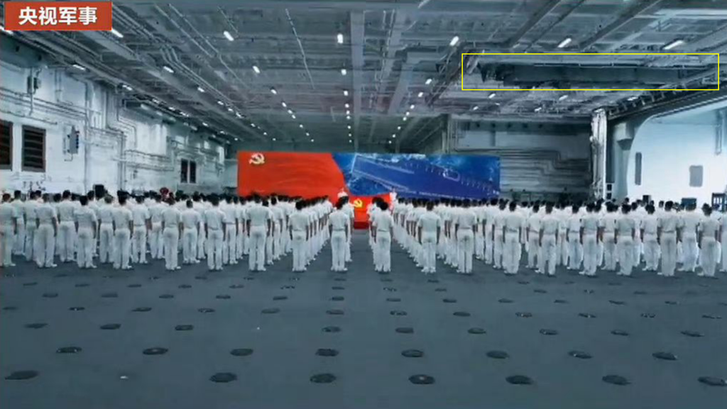 ▲首次曝光包括航母機庫畫面顯示其船艙容積相當巨大,而且已改采防火防爆效能更好的硬式防火門。 (圖/央視畫面截圖)