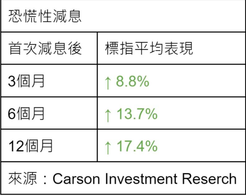 至于在恐慌性時期的減息(包括1987、1998及2020年疫情),美股后續表現則是最佳,3個月、半年及一年后,平均升8.8%、13.7%及17.4%。分析相信是由于恐慌時期往往也是絕佳的買入機會,往后股市反彈力度也最強的。
