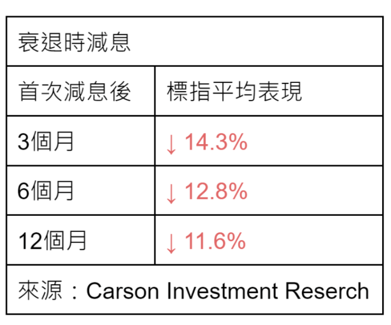 當聯儲局在經濟衰退時減息(包括1990、2001及2007年),標指則往往大跌,在首次減息后3個月、半年及一年后,平均跌14.3%、12.8%及11.6%。當中1990年的時候,減息后3個月標指大跌19.8%;而2007年金融海嘯,減息后3個月跌4.9%,而半年后及一年后則大跌14.6%及23.9%。